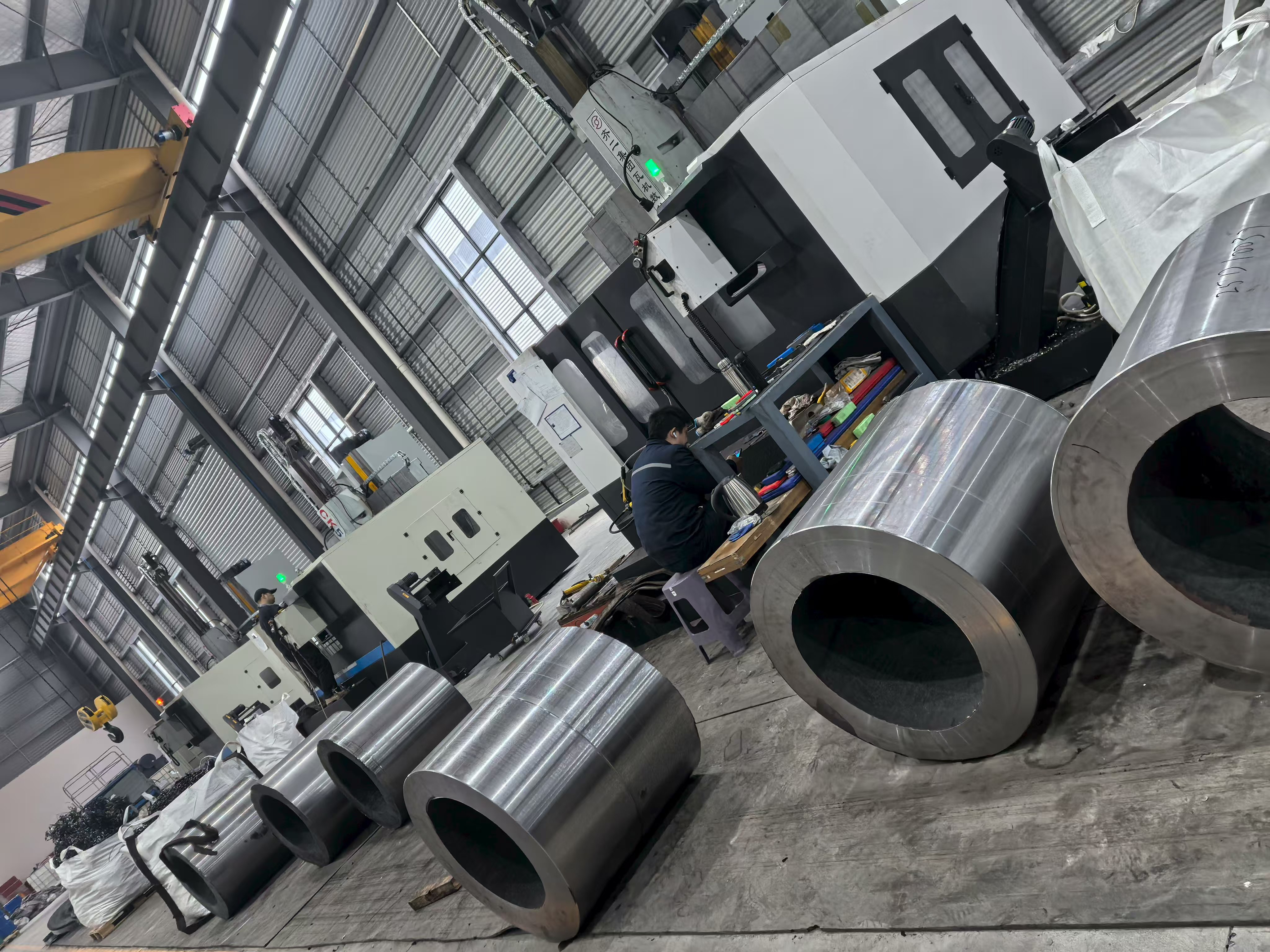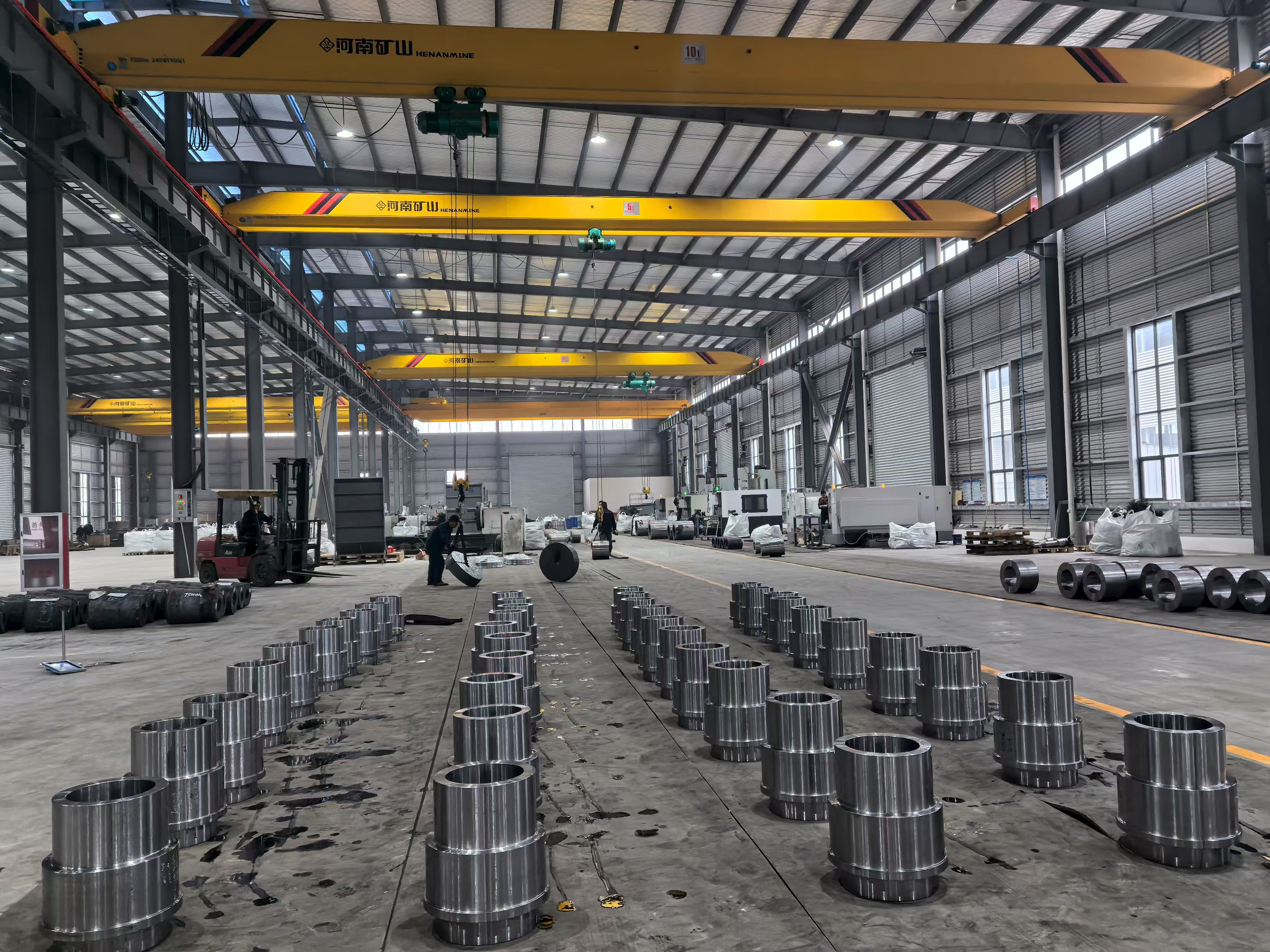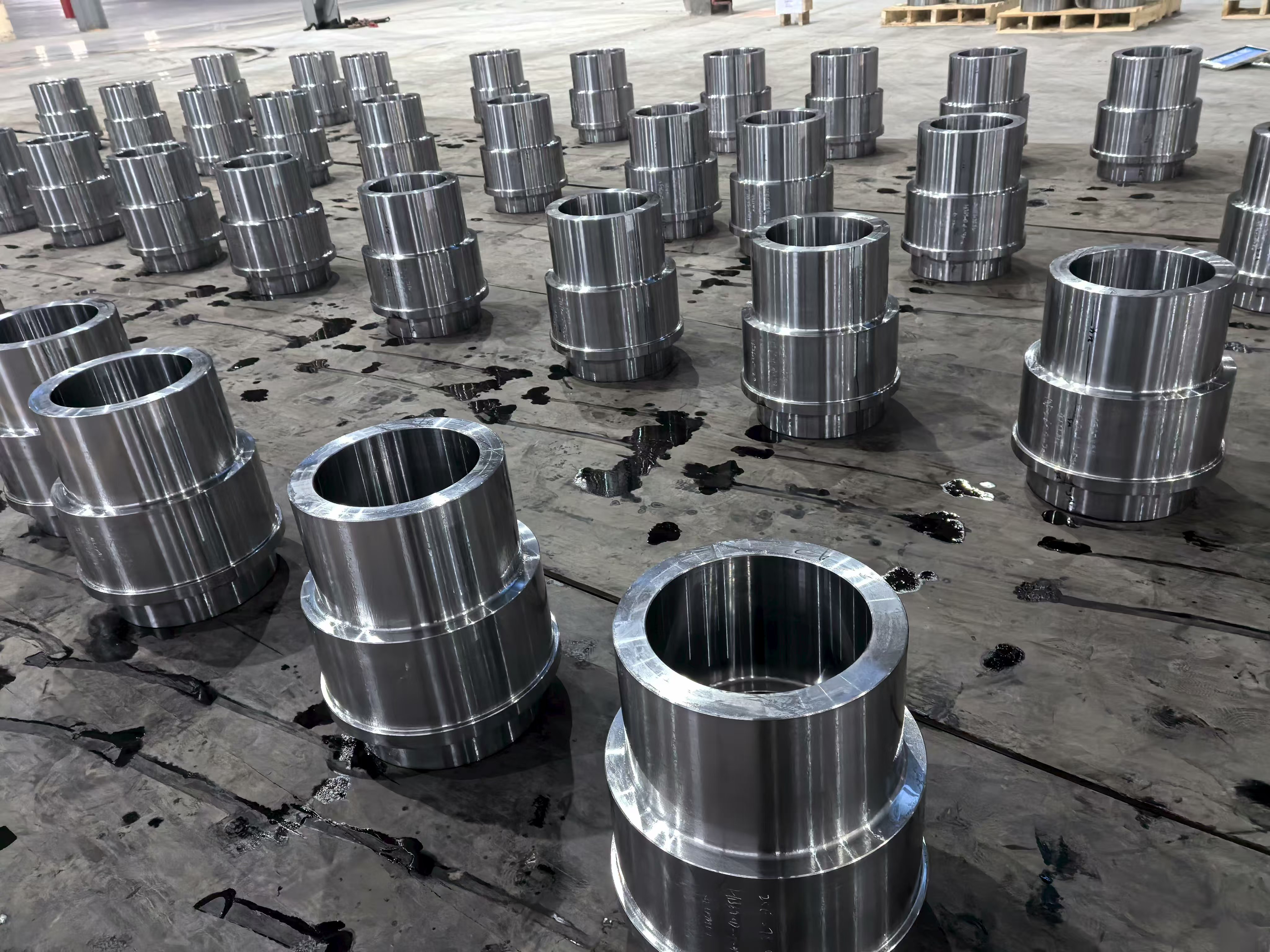 Citra fasilitas dari basis produksi menunjukkan deretan komponen cincin dan hub baja dengan mesin presisi yang diletakkan di seluruh lantai bengkel dalam pengaturan batch yang terorganisir — sebuah bukti visual atas kemampuan produksi volume tinggi grup tersebut. Setiap komponen menunjukkan penyelesaian permukaan yang konsisten, keseragaman dimensi, dan toleransi ketat yang dihasilkan dari penggabungan penempaan, perlakuan panas, dan pemesinan CNC dalam satu sistem produksi terintegrasi. Bengkel permesinan menampung beberapa pusat pembubutan dan permesinan CNC yang beroperasi secara bersamaan, dengan benda kerja mulai dari selongsong silinder berlubang besar hingga rakitan hub berflensa yang rumit.