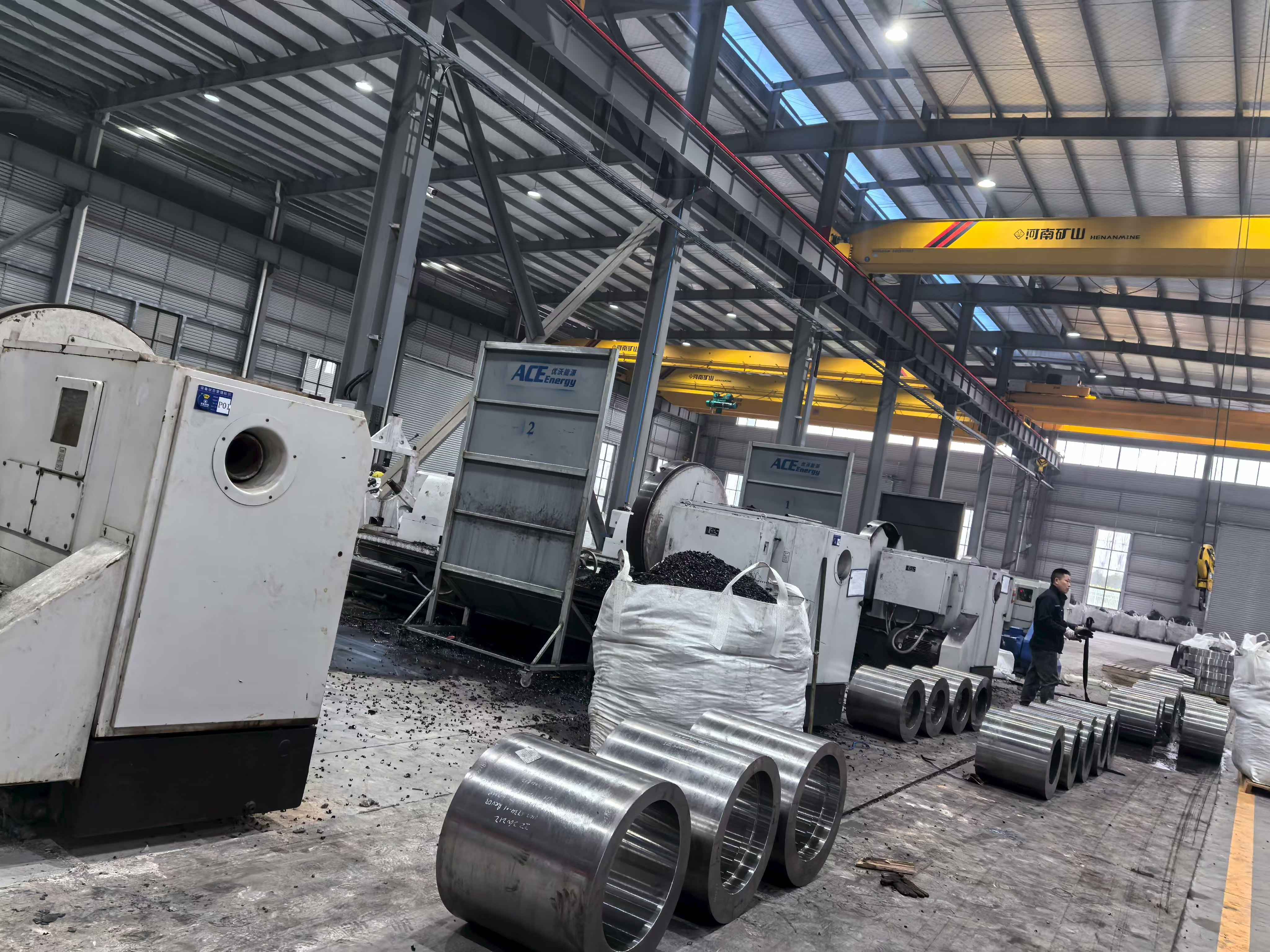 Fasilitas utama dan terbesar grup ini, basis produksi ini adalah tempat sebagian besar hasil penempaan, perlakuan panas, dan pemesinan presisi ACE Group dihasilkan. Fotografi fasilitas menunjukkan skala operasi ini dengan jelas: bengkel struktur baja teluk tinggi yang luas dilengkapi dengan beberapa derek jembatan di atas kepala, pusat permesinan CNC format besar yang memproses komponen silinder berat, dan kumpulan suku cadang yang dikerjakan dengan mesin presisi yang tersusun rapi dan siap untuk inspeksi dan pengiriman. Tata letak lantai bengkel mencerminkan manajemen aliran yang terorganisir — bahan mentah dan bahan dalam proses dipisahkan dari komponen jadi, dan zona produksi digambarkan dengan penandaan lantai yang konsisten dengan prinsip lean manufacturing.